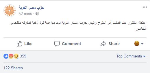 نقل موقع “مصراوي” الإلكتروني عن مصدر أمني مصري قوله إن اعتقال أبو الفتوح وقيادات حزبه جاء على خلفية “اتصاله بجماعة “الإخوان المسلمين” الإرهابية”، مشيرًا إلى أنهم “يخضعون للتحقيق حالياً بمعرفة الأمن الوطني”.