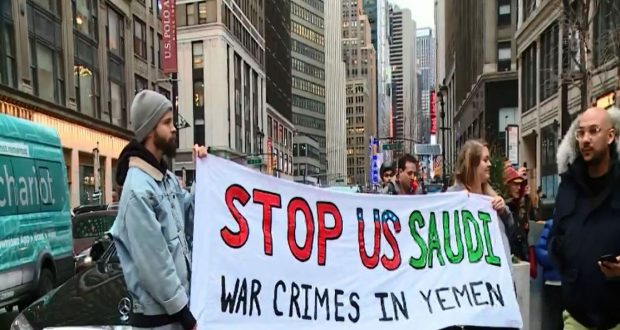 نيويورك / نبأ – نظم ناشطون وممثلون عن منظمات حقوقية أميركية في نيويورك مظاهرة أمام مقرِّ انعقاد “الملتقى الأميركيِّ السعودي للمديرين التنفيذيين”، رفضاً لزيارة ولي العهد السعودي محمد بن سلمان إلى المدينة وتنديداً بالعدوانِ على اليمن.