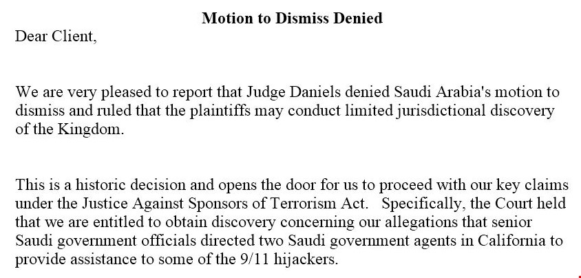 وفي القرار القضائي الذي اتخذه القاضي دانييلز في محكمة نيويورك والمؤلف من 41 صفحة “رفض إدعاءات المدّعين المتعلقة بالمفوضية السعودية العليا، وقلّص بعض الجوانب التي قدمها أصحاب الدعوى ضد السعودية”، بحسب رسالة شركة المحاماة المرفقة.