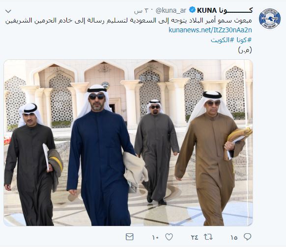 وكانت الوكالة قد نشرت تغريدة على حسابها على “تويتر” أفادت بأن محمد الصباح سيسلم الرسالة إلى الملك سلمان بن عبد العزيز، ثم حذفتها ونشرت تغريدة أخرى أوردت فيها أن الرسالة ستسلم إلى ولي العهد السعودي حصراً، بحسب وكالة “سبوتنيك” للأنباء.