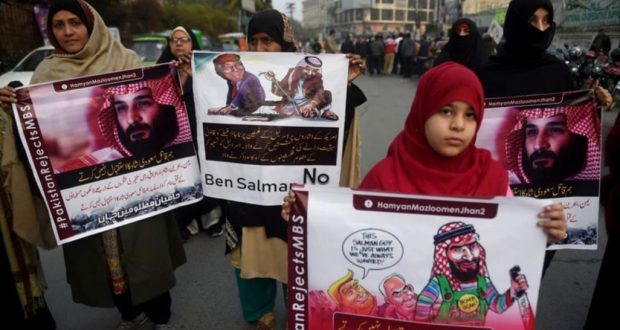وبرغم ذلك، فقد شهد العديد من المدن الباكستانية، وأبرزها لاهور، احتجاجات ضد زيارة ولي العهد السعودي رفع خلالها المحتجون لافتات تندد به وبسياسته، وتعتبره شخصاً غير مرحب به. وتضمنت اللافتات أيضاً صوراً تعبّر عن دور ابن سلمان في قتل خاشقجي والعدوان على اليمن، فيما ظهرت بعض الصور تصفه بـ “الرجل المفضل” للولايات المتحدة وكيان الاحتلال الاسرائيلي الذي يقتل الفلسطينيين.