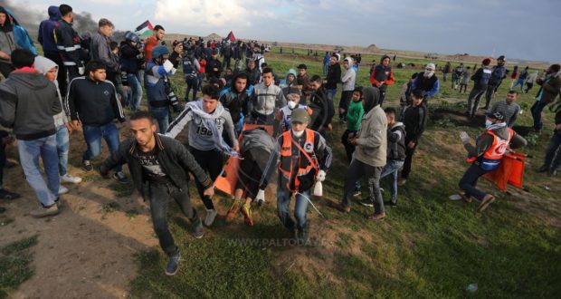مشاركون في مسيرة العودة ينقلون جربحاً أصيب برصاص قوات الاحتلال (بال توداي)