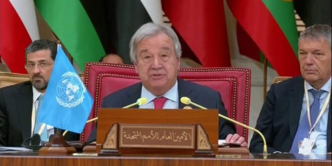 ودعا غوتيرش، في كلمته خلال الدورة الـ33 للقمة العربية في العاصمة البحرينية المنامة، إلى “الوقف الفوري لإطلاق النار لأسباب إنسانية وإتاحة وصول المساعدات الإنسانية دون عوائق إلى جميع أنحاء قطاع غزة”.