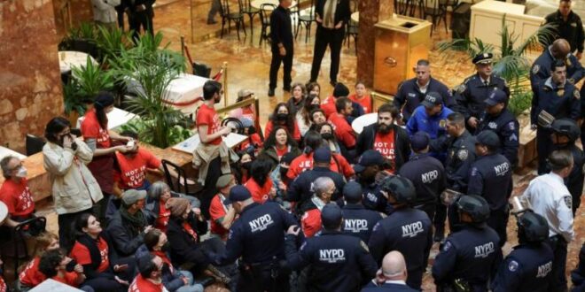 نبأ- اقتحم مئات من النشطاء المؤيدين للفلسطينيين، برج ترامب رفضاً لما وصفوه بممارسات قمع حرية التعبير من قبل الرئيس الأميركي. ورفع المشاركون لافتات وشعارات مناهضة لترامب.