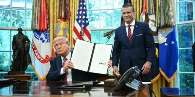 نبأ – وقع الرئيس الأميركي دونالد ترامب، مساء الجمعة، أمرا رئاسيا يقضي بتغيير اسم وزارة الدفاع إلى وزارة الحرب، وذلك في مؤتمر صحفي عقده في البيت الأبيض، ضمن ما وصفه بخطوات إعادة هيكلة البنتاغون.