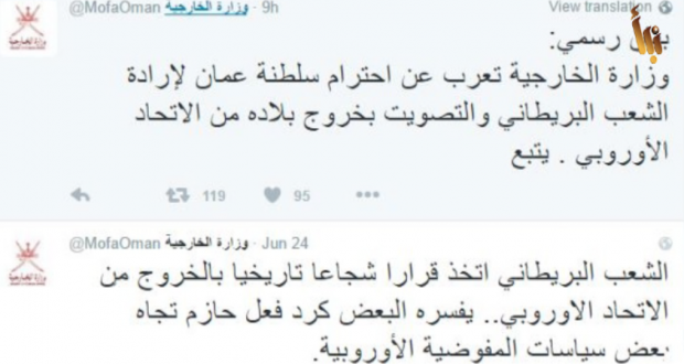 مراقبون رأوا ان رغبة مسقط بالتفلّت من الالتزام بما تريده الدول الخليجية مجتمعة، تكبر يوما تلو الاخر، وتتكشف للعلن، من خلال ثناءها على انفصال بريطانيا، واعلانها احترامها لإرادة الشعب البريطاني في التصويت لخروج بلاده من الاتحاد الأوروبي خلال الاستفتاء الشعبي.