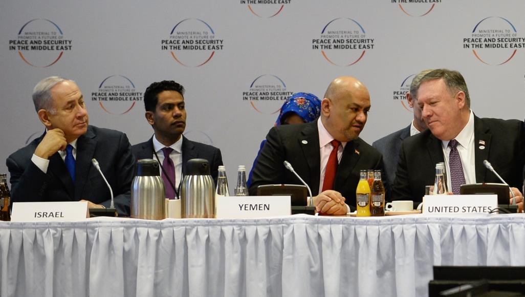 وارسو: وزير خارجية حكومة هادي الموالية للسعودية جالساً بجانب نتنياهو