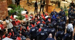 نبأ- اقتحم مئات من النشطاء المؤيدين للفلسطينيين، برج ترامب رفضاً لما وصفوه بممارسات قمع حرية التعبير من قبل الرئيس الأميركي. ورفع المشاركون لافتات وشعارات مناهضة لترامب. كما ارتدى النشطاء قمصاناً حمراً تحمل شعار “لنجعل أميركا عظيمة من جديد”، في إشارة …